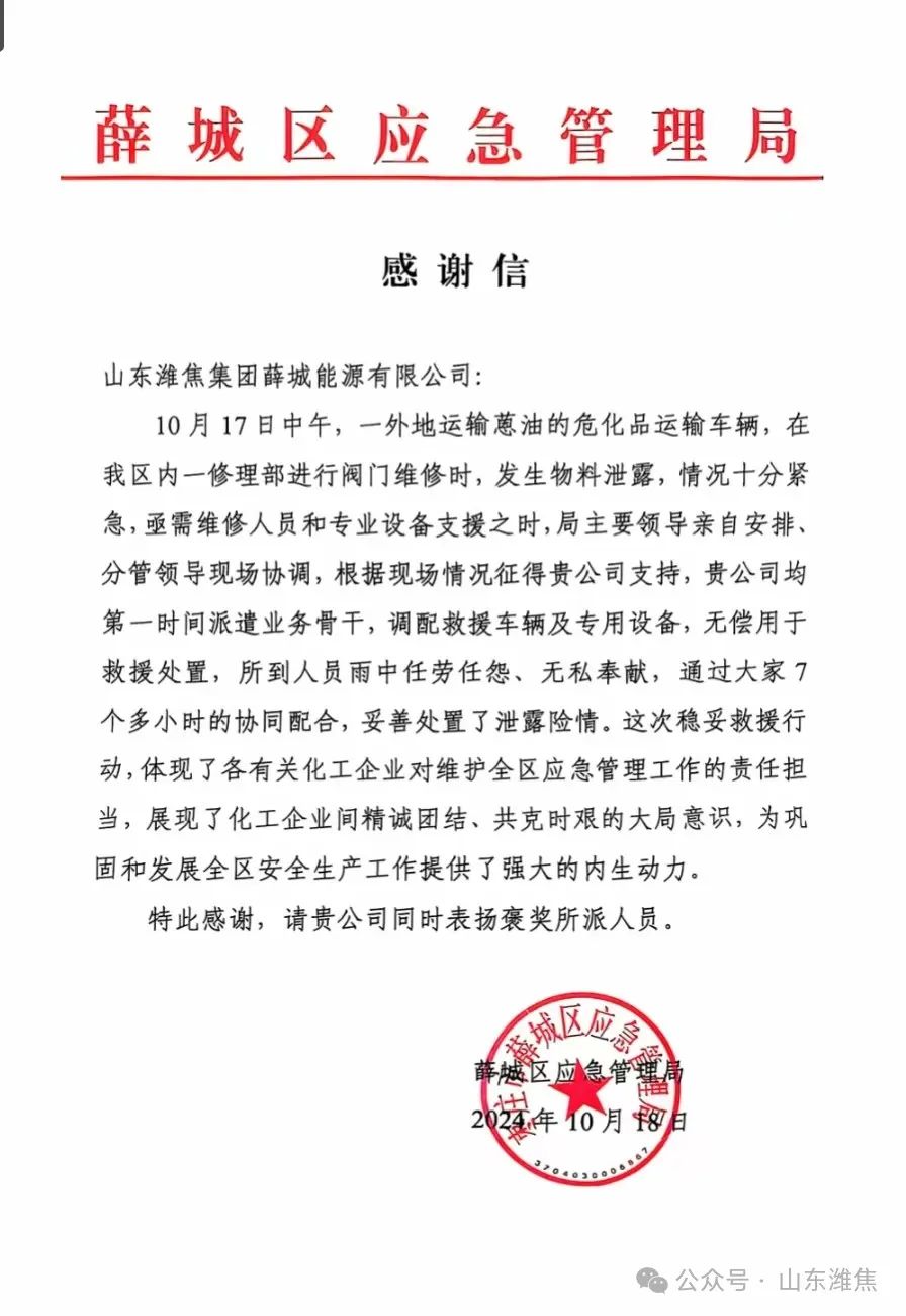 薛城能源公司收到薛城區應急管理局感謝信